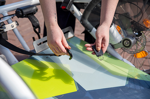 Our wheelchair cargo bike can be fitted with a winch system that makes it easy to get the user in the manual wheelchair onto the bike – without any physical effort. The winch helps to pull the manual wheelchair with the user up the tilting ramp, thus completely relieving the driver during both boarding and disembarking.