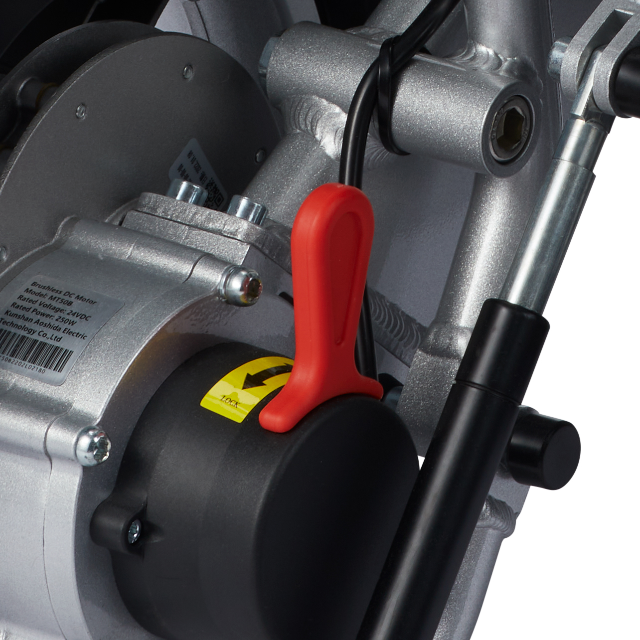 Frikoblingshåndtag sidder på hver sin motor. Når håndtagene skubbes frem mod batterierne, frakobles de magnetiske bremser, og stolen kan rulles manuelt.