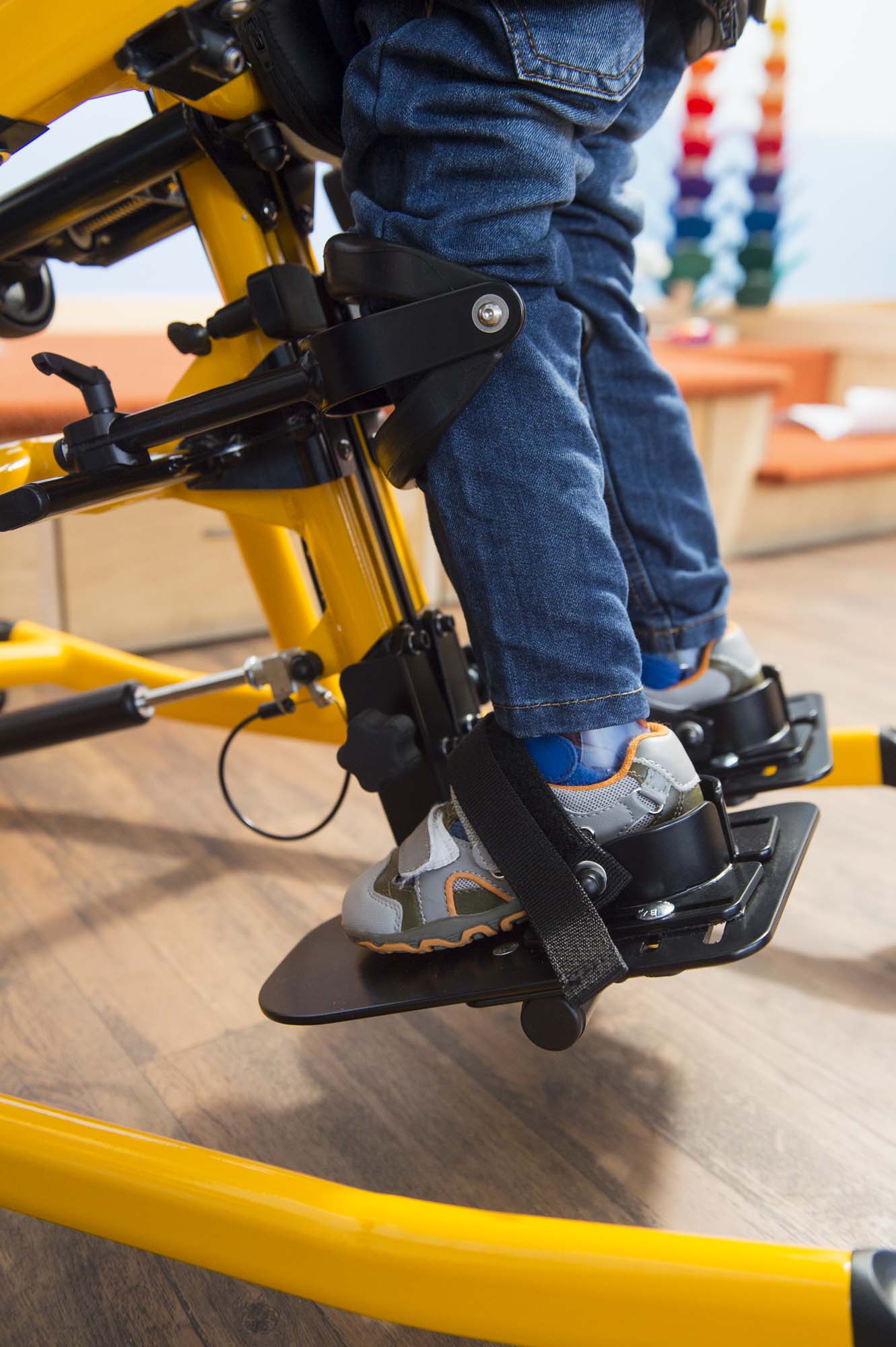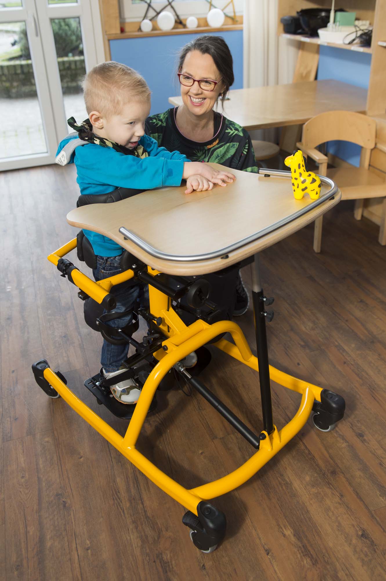 Tim hjælper med at øve balancen og styrke muskler og knogler, samtidig med at blodomløbet får et godt boost. Den giver sikkerhed under hele træningen, også når kroppen lænes frem eller tilbage, fordi støtten kan tilpasses i både højde, dybde og vinkel. Tim er designet, så barnet kan være på øjenhøjde med andre børn under leg og aktiviteter. Bækkenstøtten kan justeres langsomt med et håndsving, så både knæ og hofter får den rette opretning, og midtersøjlen kan vippes, så skift mellem aktive og rolige faser bliver nemt. Bryststøtten med sider giver stabilitet for overkroppen, mens knæstøtterne tilpasses, så de altid giver en behagelig og tryg støtte. Den delte fodplade kan indstilles, så den passer til forskellige benlængder, og store hjul med bremsestop sikrer, at træneren står stille, når barnet skal ind eller ud. Det gennemsigtige bord kan bruges til leg eller undervisning og kan tilpasses med eller uden armstøtte, rille eller låg, mens hovedstøtten giver ekstra tryghed bagfra.